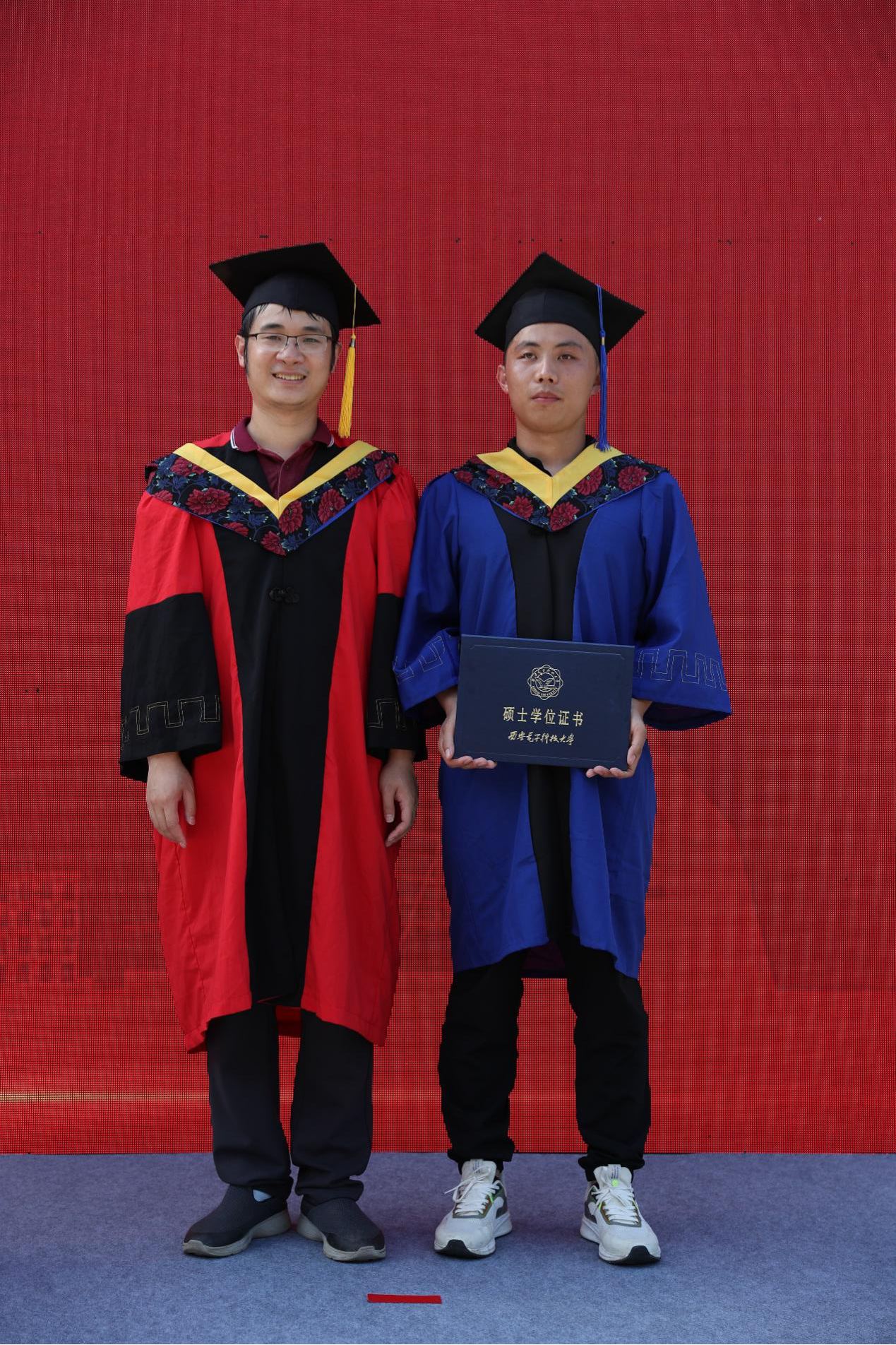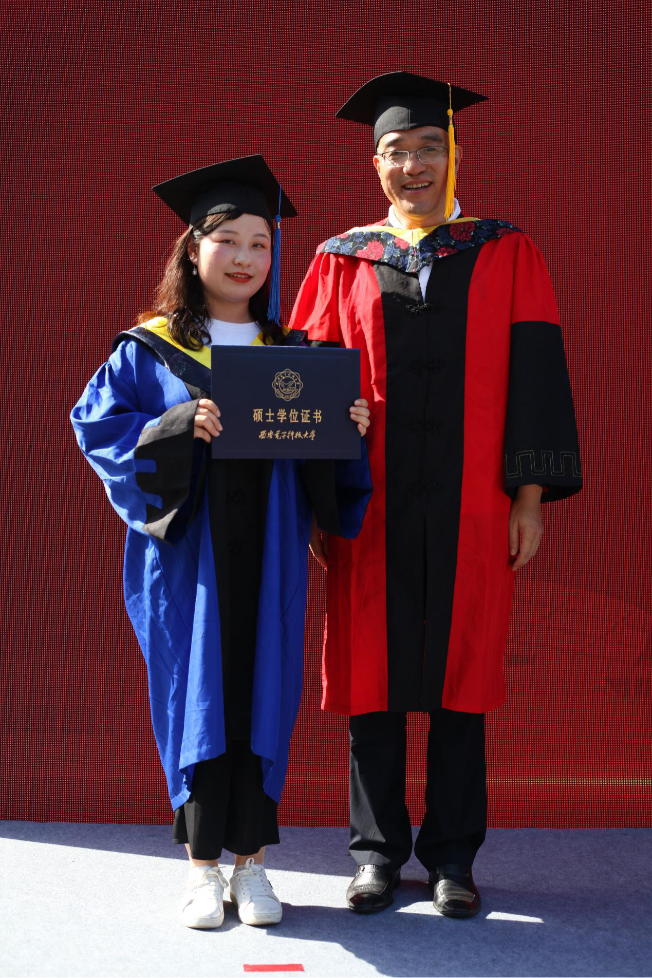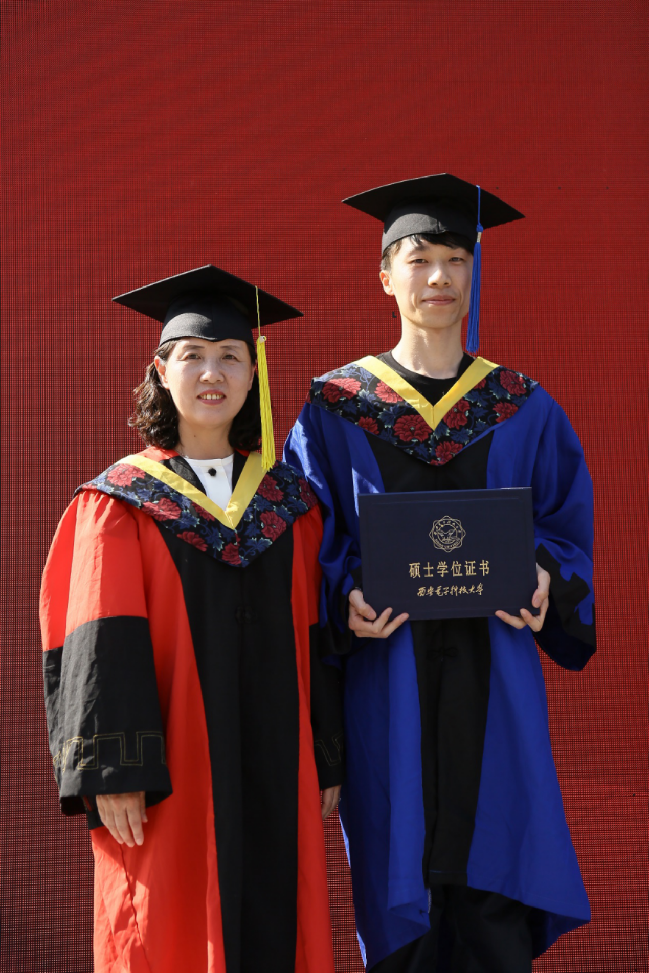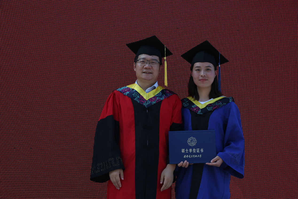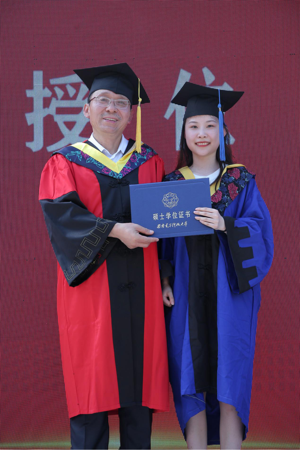 研究生毕业生代表向导师赠礼献花,“就要告别西电,献花那一刻,脑海中不断闪现和老师相处的点滴日常,那些平凡的时刻在此刻都愈显珍贵。”研究生郭佳不舍离别湿了眼眶。