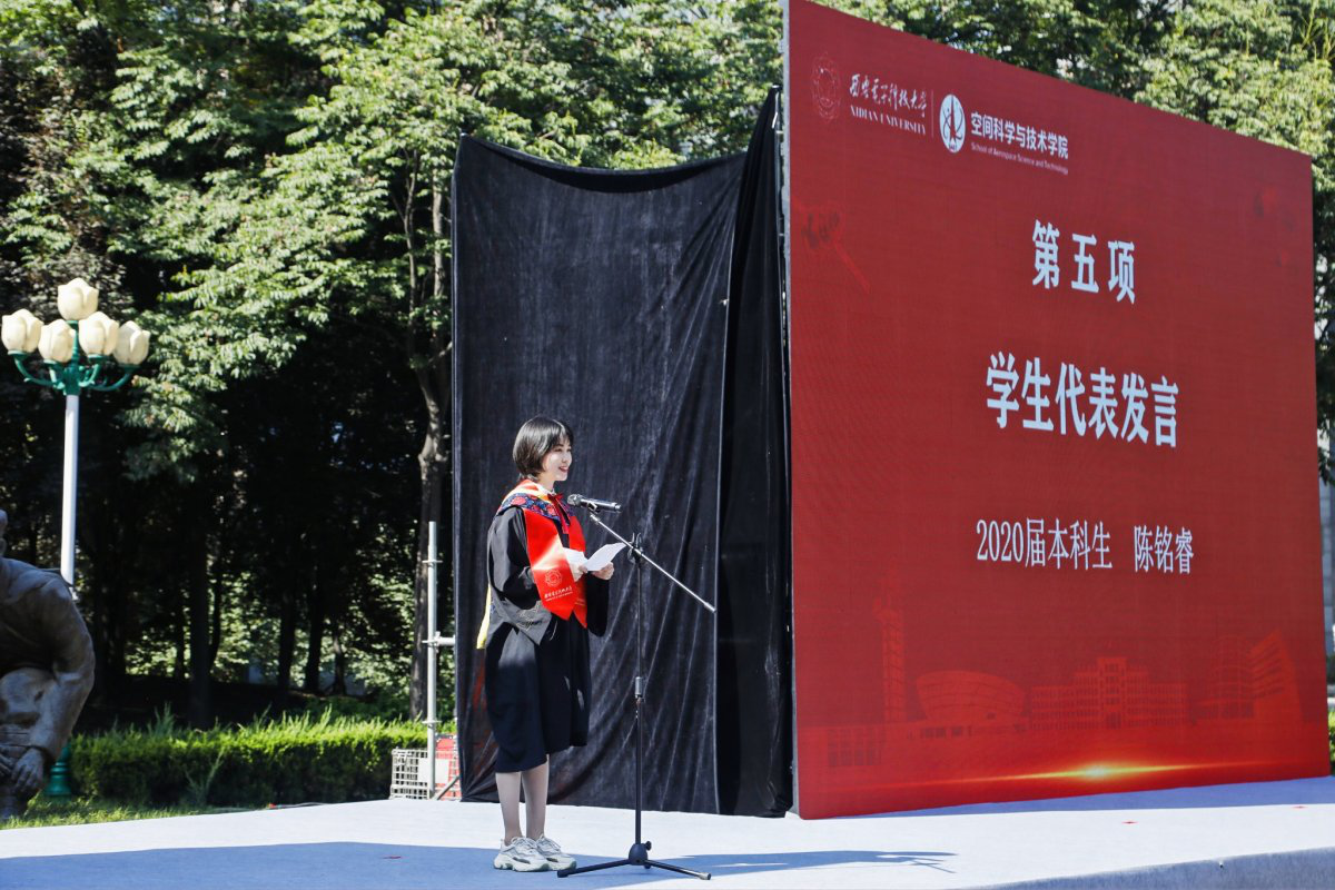 “请允许我代表fun88官网体育全体毕业生,向疫情期间所有奋战在第一线的逆行者致以最崇高的敬意,也向精心栽培我们的领导老师和悉心关怀我们的父母亲人,致以最衷心的感谢!”本科毕业生代表陈铭睿以“我和西电的四年之约”为题,谈及fun88官网体育历史性时刻和在校园各个角落的点点滴滴,并激励全体同学:“不忘‘西电红’的底色和‘三有西电人’的使命担当,认准心之所向、身之所往,与航天精神相伴,与共和国同行。”