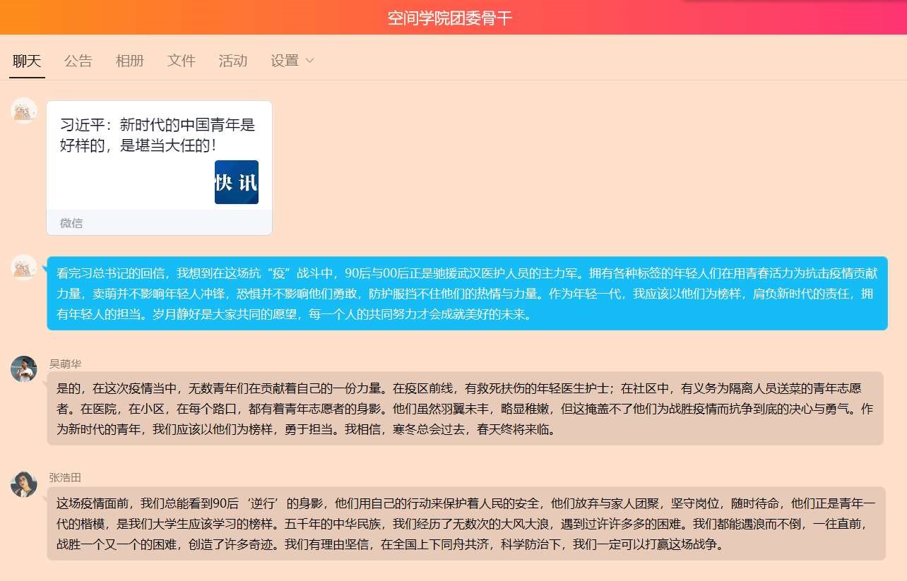 在这次抗击疫情的斗争中,以“90后”为代表的青年一代挺身而出、担当奉献,充分展现了新时代中国青年的精神风貌。在此次疫情防控阻击战中,空间学子始终秉持着“厚德、求真、砺学、笃行”的西电校训,用实际行动践行“全心全意为人民服务”的西电精神,用自己的方式付出和坚守,为打赢这场人民战争贡献着智慧和力量。小我融入大我,青春献给祖国,缪力同心,共克时艰,空间学子正在用实际行动诠释当代青年的初心与使命,责任与担当。