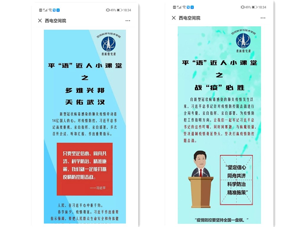 5799.47元爱心捐款金额虽然并不庞大,但饱含着关切守望的拳拳爱心,确是员工们情真意切的全心支持;《平“语”近人小课堂》漫画之新冠疫情特刊,笔触虽然不尽善尽美,但学言学语生动展现了习近平总书记关于抗击疫情的重要讲话精神和抗疫防控方针政策;原创疫情防控抖音微视频用员工们喜闻乐见的形式传播着抗疫正能量,“众志成城 空间有声”栏目中员工们真挚的话语表达着对抗疫一线工作者的尊崇与鼓舞......众志成城、齐心战“疫”,空间学子们在疫情防控这段特殊的历史中描画出亮丽的青春底色。