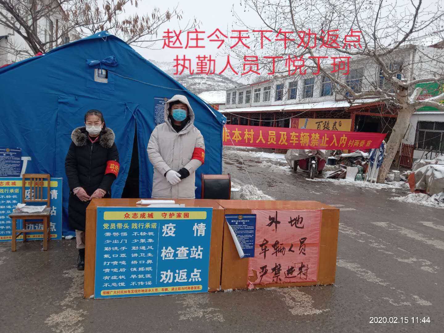 疫情发生后,张魁联系到了村里党群服务中心的工作人员,一番商量后,张魁便开始招揽“人手”——发动自己的发小同学共同参与村里的体温登记、资料分发和政策宣传等工作。与此同时,张魁与伙伴们还参加了村口检查点的值守工作,时值雨雪天气,有时室外寒风达到四五级,站立都存在一定困难,他们依旧坚守岗位,保障来往车辆行人的有序通行。