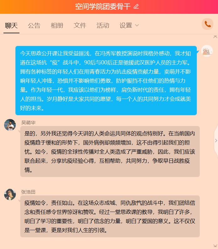 fun88官网体育团委骨干张博康说:“今天思政公开课让我受益匪浅,在冯秀军教授演说时我格外感动,我才知道在这场抗“疫”战斗中,90后与00后正是驰援武汉医护人员的主力军。拥有各种标签的年轻人们在用青春活力为抗击疫情贡献力量,卖萌并不影响年轻人冲锋,恐惧并不影响他们勇敢,防护服挡不住他们的热情与力量。作为年轻一代,我应该以他们为榜样,肩负新时代的责任,拥有年轻人的担当。岁月静好是大家共同的愿望,每一个人的共同努力才会成就美好的未来。”