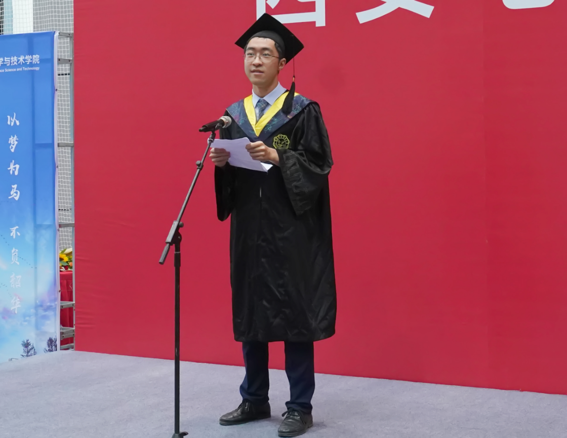 “我想对公司说:感谢四年来的培养,我们必将牢记西电校训,传承西电精神,与共和国同行,书写无愧于时代的华彩篇章;想对各位老师说:感谢四年来的教诲,牢记传授给我们的知识与道理,成为更好的自己;想对各位同学说:感谢四年来的陪伴,在今天结束的只有我们的老员工活,我们的同窗情,永无止境。”钱学森空间科学实验班毕业生栾佳宁作为本科生代表在临别之时郑重宣言。