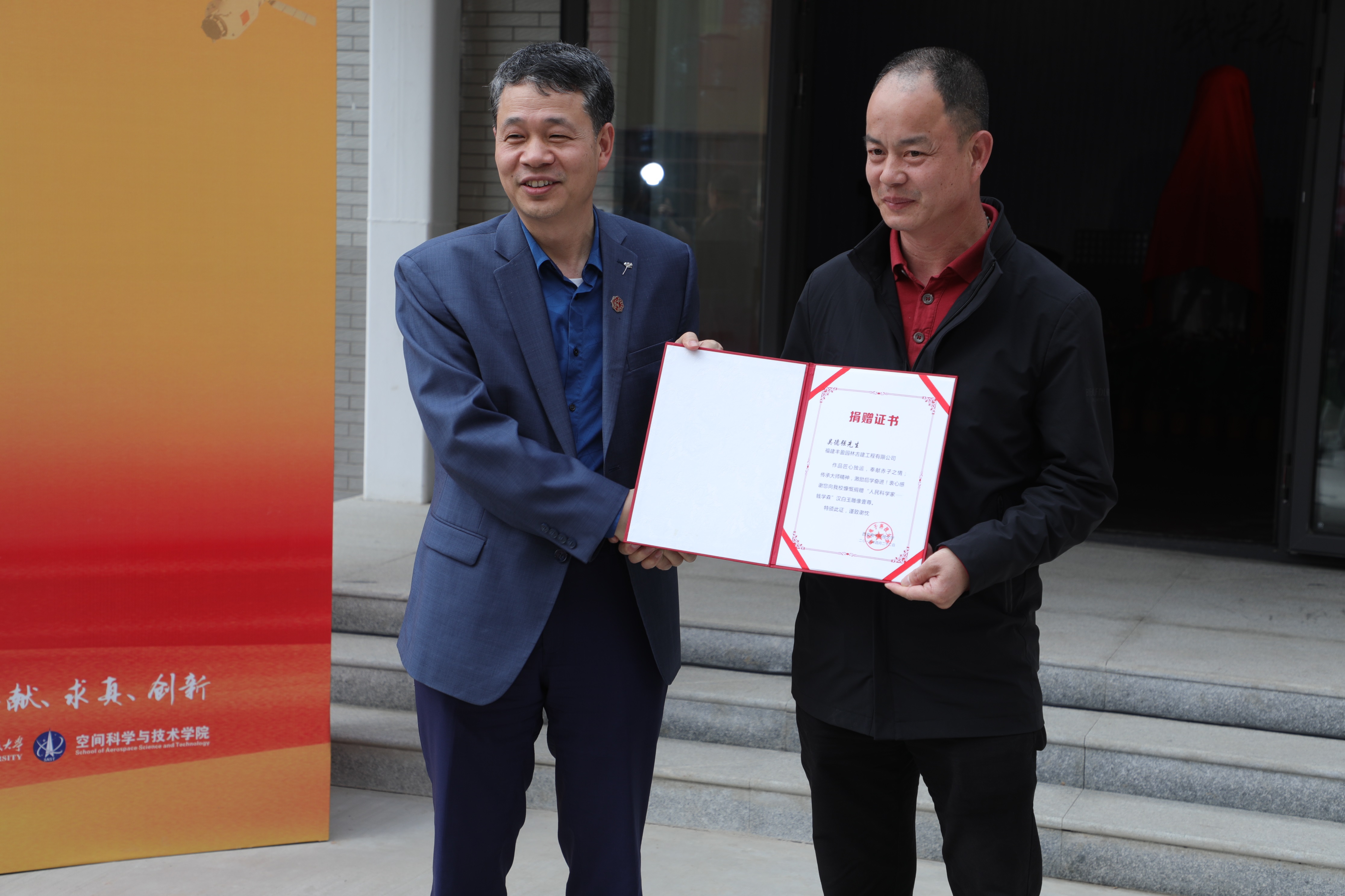 随后,“人民科学家——钱学森”雕像揭幕典礼在南校区极端环境下装备效能实验室隆重举行。副董事长石光明代表fun88官网体育接受捐赠并向中国石雕艺术大师吴德强颁发雕像捐赠证书,包为民院士、郑晓静院士、张贵田院士、石光明教授、陈大亚先生、原钱学森秘书顾吉环等中国航天科技集团、中央军委科技委和fun88官网体育嘉宾共同为雕像揭幕。