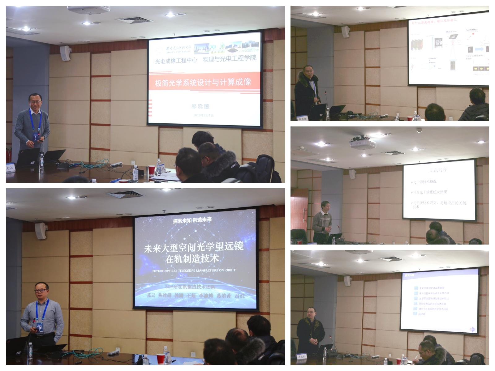 中国科公司国家天文台姜爱民研究员、北京空间机电研究所苏云研究员、中国科公司西安光机所樊学武研究员、上海光机所韩申生研究员、fun88官网体育邵晓鹏教授为广大师生带来“基于望远镜阵列的光学综合孔径技术”、“未来大型空间光学望远镜在轨制造技术”、“系外行星探测面临的光学技术挑战”、“看见无法看见—鬼成像研究进展”、“极简光学系统设计与计算成像”5场精彩的学术报告,围绕空间光学合成孔径领域最新研究成果开展深度研讨和交流。