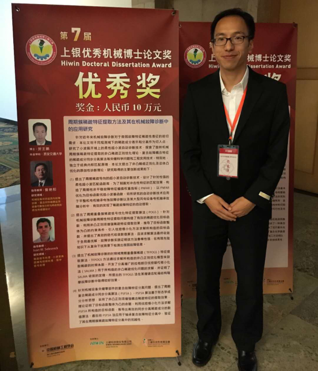 11月13日,由中国机械工程学会主办的第七届上银优秀机械博士论文奖颁奖典礼在山东济南举行。fun88官网体育青年教师贺王鹏的博士论文《周期簇稀疏特征提取方法及其在机械故障诊断中的应用研究》获得“上银优秀机械博士论文奖”优秀奖。这是fun88官网体育师生首次斩获此全国性机械工程学科博士学位论文最高奖项。