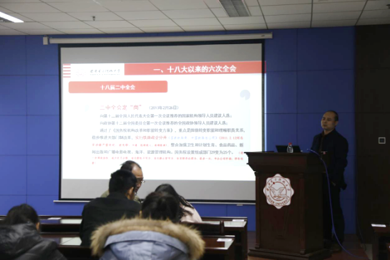 何翔老师介绍了十八大以来的六次全会,并且就每次全会的任务及意义做了简要分析,和师生党员们分享了十八届六中全会的核心内容与精神,通过实例以及新闻案例阐述了中央全面从严治党的路径。在报告中,何翔老师根据陕西地方特点以及资源分布,介绍了陕西十八大以来日新月异的变化,并且从资源,人文,科技等方面综合阐述了未来陕西发展的优势。报告最后,何翔老师结合自身思考,提出了作为老员工应该如何从自身做起,践行全面从严治党,他指出老员工应该具有理性精神,并且在大学期间积极培养自己的各项能力,比如有效地表达自我,自我迁移以及高度的社会责任感等。