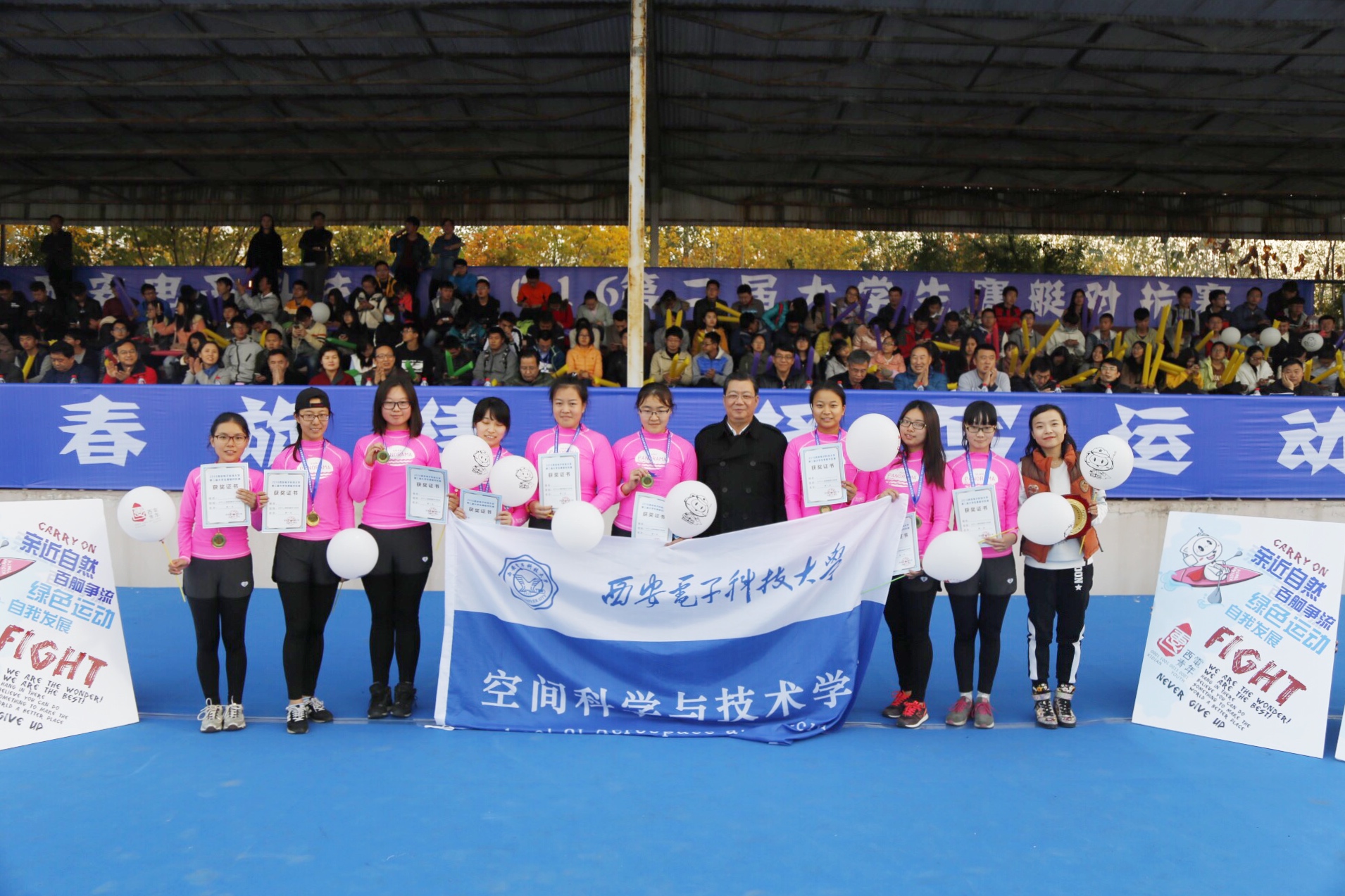 预赛结束后,最激动人心的决赛来临了。首先进行的是女子组的决赛,所有人紧张的盯着远处的起点,等待着开始的号令。比赛开始!同样是那抹粉红色,这一次同样一马当先飞速划来,经过时,“心向空间,破浪踏前,追风逐电,剑指峰巅”的口号声响彻天际,最终,女子赛艇队不负众望,拔得头筹!