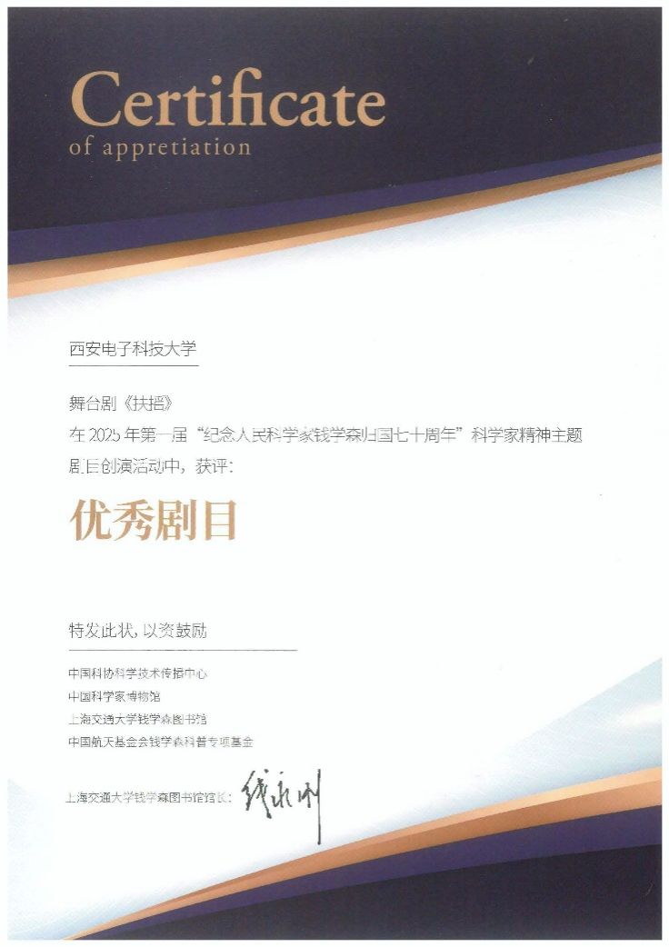 (通讯员 郑瑞博)12月11日下午,由中国科协科学技术传播中心等单位联合举办的“纪念人民科学家钱学森归国七十周年”科学家精神主题剧目创演活动颁奖仪式在上海交通大学举行,fun88官网体育原创舞台剧《扶摇》在众多优秀作品中脱颖而出,获评“优秀剧目”。