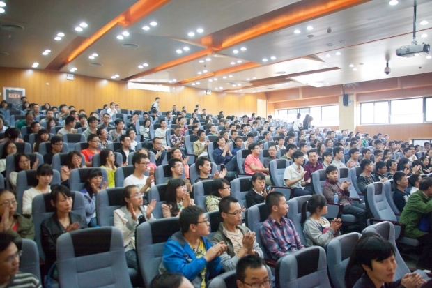 杨宏展示了很多航天员在天宫舱内的生活照,生动地讲述了设计中很多人性化方面。他说,为了适应女航天员的需要,他们特意准备了“带花”的睡袋;还在负重极轻的前提下,在舱内为航天员准备了小礼物等他们自己去发现。提及神舟十号女航天员王亚平的首次太空授课,他骄傲地说:“六千万的受众是任何国家都无法比拟的成绩。”同学们的自豪感油然而生,报告厅内响起热烈的掌声。