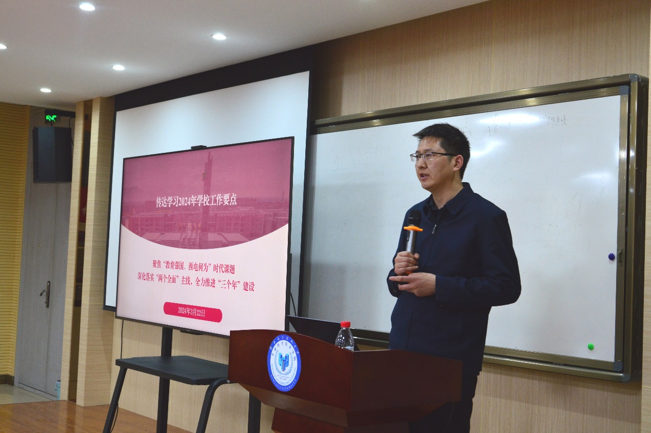 3月21日下午,fun88官网体育在南校区召开全体教职工大会,传达公司2024年工作会议精神,安排部署公司年度工作。陕西省两会精神宣讲专家、马克思主义公司教授曹飞,党委教师工作部副部长王蓓金来院交流,公司班子成员、教职工和员工代表等80余人参加会议,会议由公司党委副书记卢毅主持。