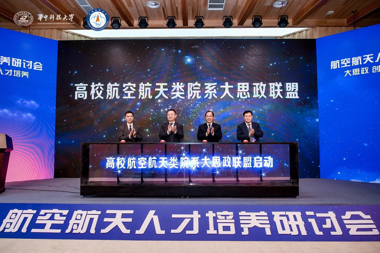 李平、王一然、廖文和、张耀共同为高校航空航天类院系大思政联盟揭牌,华中科技大学航空航天公司被推选为联盟首任轮值理事长单位。会上,各参会高校围绕航空航天人才培养的思政教育工作和思政体系建设展开深入交流,共同探讨从多个维度深化育人体系建设,贯彻落实思政育人政策,加强融入航天精神教育,促进员工全面化、多样性发展。