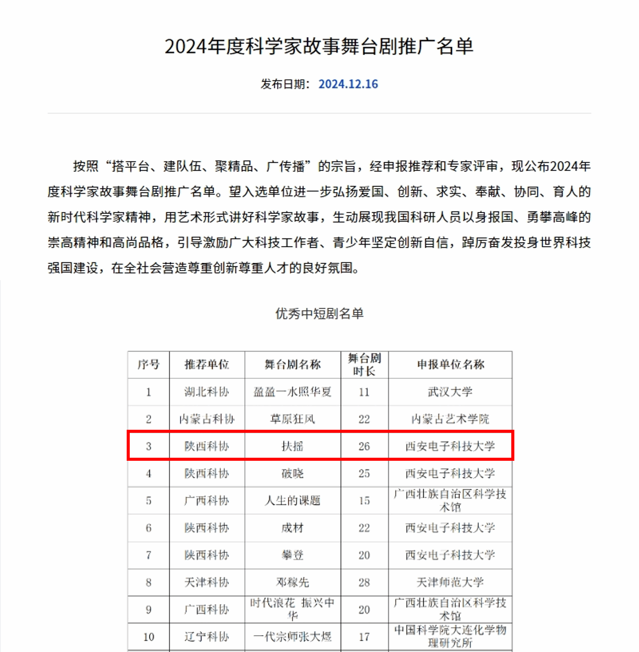 近日,中国科学技术协会公布了“2024年度科学家故事舞台剧推广名单”,fun88官网体育原创舞台剧《扶摇》成功入选,获评“优秀中短剧目”。