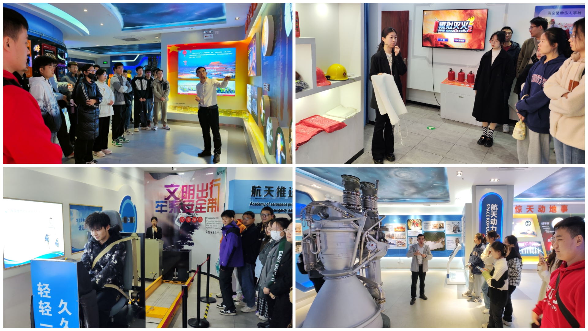 随后,讲解员带领同学们参观了火箭发动机模型,详细讲解发动机燃烧室、喷嘴、涡轮泵等关键部件,以及各部件如何协同工作产生推力。最后,同学们来到应急安全体验馆学习生活生产安全知识和应对方法,借助各类模拟设备沉浸式参与多种互动项目,包括醉酒体验、安全驾驶撞击体验、烟雾逃生体验、地震震动体验、弱电电流体验等,通过将生产生活中可能遇到的危险在安全情况下真实模拟,切实提高突发事件的应对能力和水平。
