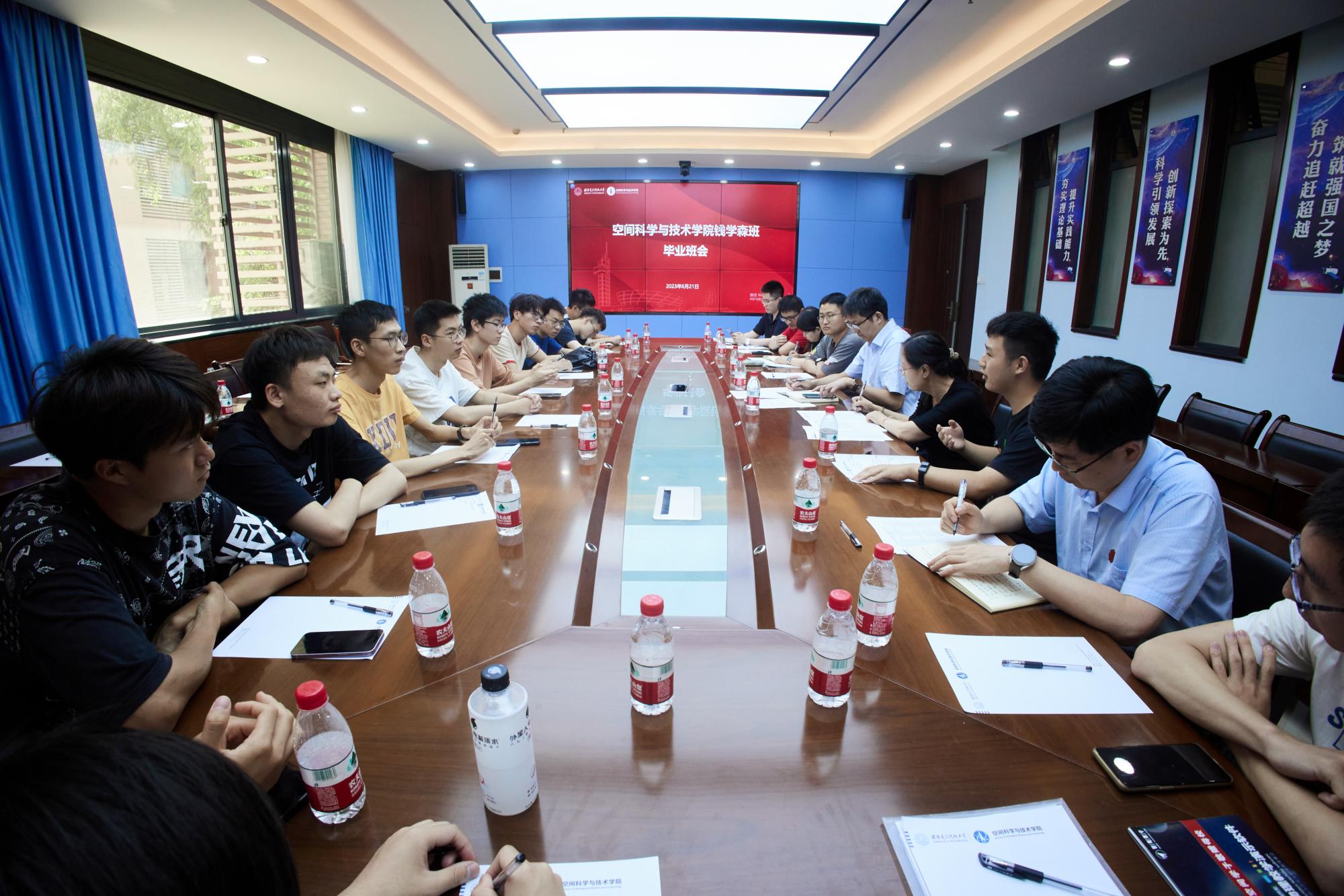 从回顾个人成长到建言公司发展,再到投身航天强国建设,现场师生畅所欲言,家国情、师生情、西电情,情义浓浓。座谈会上,2023届钱学森班班长冯献礼围绕班级概况、毕业去向、班团活动、主要成绩等方面详细汇报了钱学森班的整体情况。“32人的班级中大学四年无一人挂科,主干课程平均成绩88分,创历届钱班新高。班级中27人选择读研深造,其中半数以上继续深耕空间科学及航天领域,1人被清华大学录取,2人被浙江大学录取,3人被中国科学技术大学录取,7人进入中科院科研院所和天文台读研……。全体同学在班级团结互助进步的氛围浸润下交出了一份令人满意的答卷,四年来共获得国际级、国家级奖项20余项,省级奖项40余项,班级员工发表论文3篇、专利及软著4项。班级及团支部获评2020年度校级五四红旗团支部、2021年度校级十佳标兵示范班等称号。”各类获奖证书与荣誉称号见证了32位钱班学子德智体美劳全面发展的求学历程。